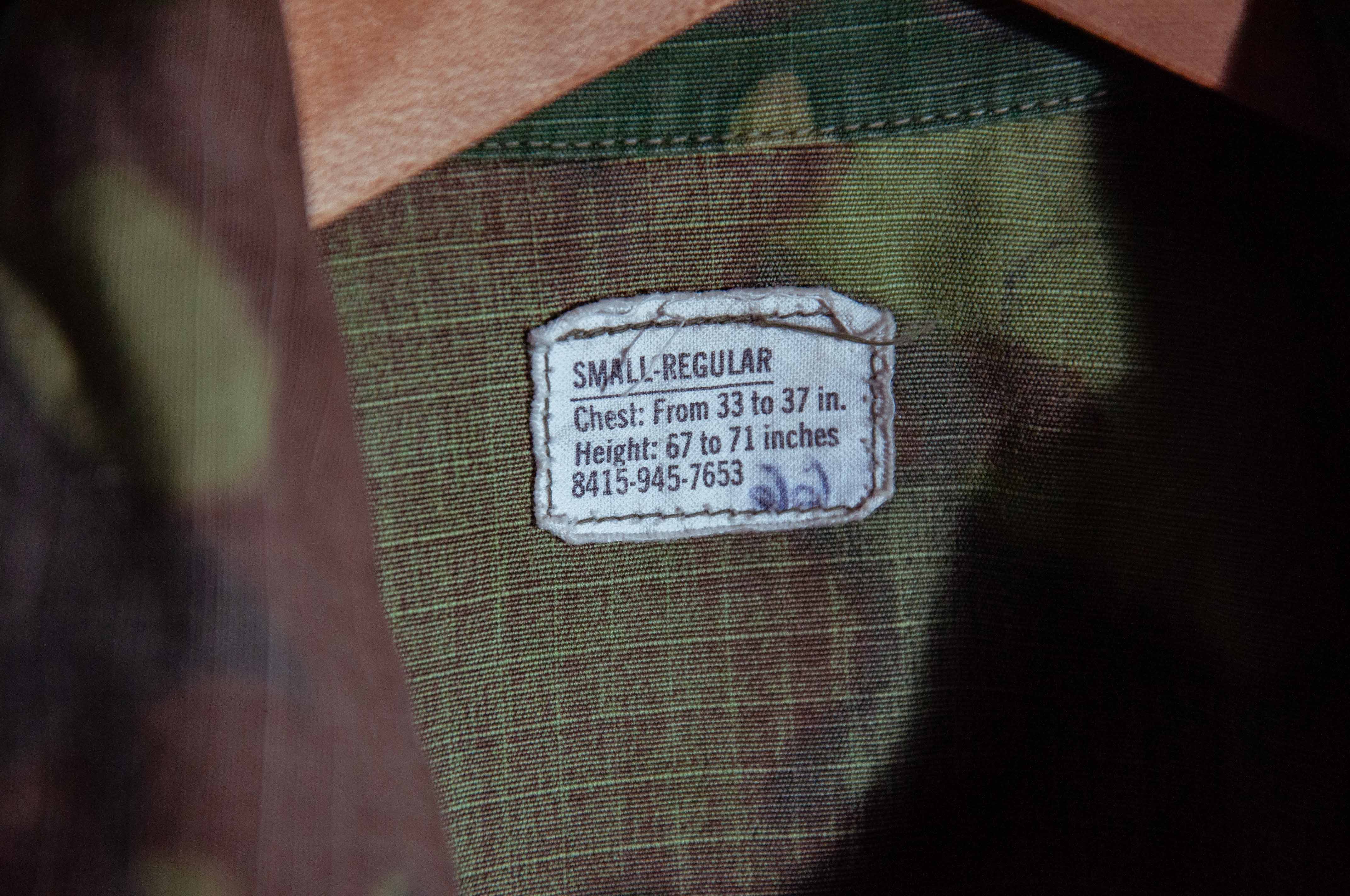 而叢林野戰襯衫大致可分為五個版本,但若要更加詳細的區分,則又可分成十種版本。此為使用 Rip-Stop 布料 ERDL 迷彩版本的初期型。