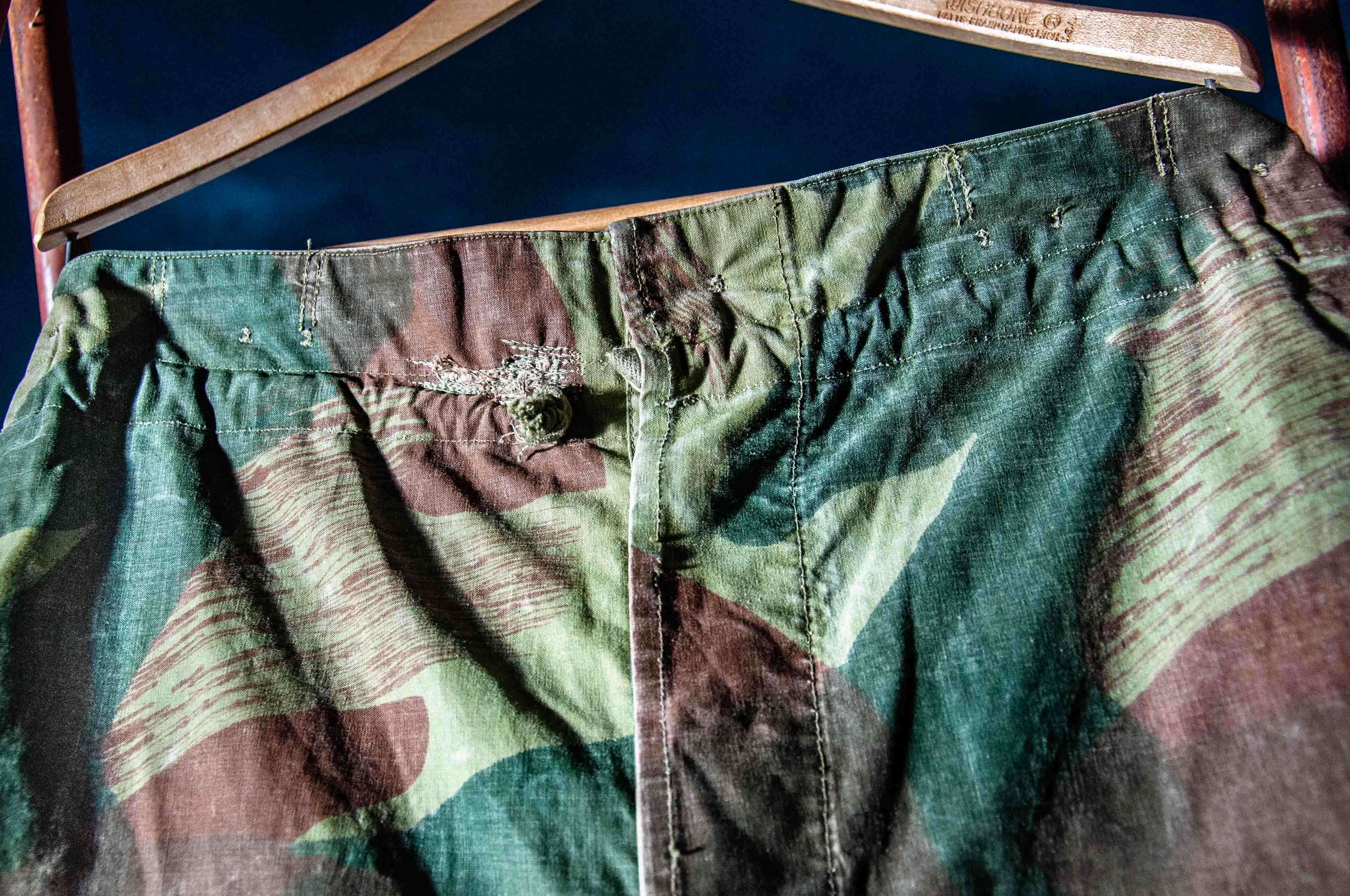 比利時的筆刷迷彩作戰服有分上身的罩衫及下著的長褲,此次所販售的為1956年生產的筆刷迷彩軍褲。布料十分厚實硬挺,若有需求可上防水蠟,增強褲子的機能性。腰部使用抽繩調節,而除了左右兩個口袋外,左側大腿還有一個有蓋野戰口袋,能提供較大的收納空間。另外在褲子最容易磨損的跨下及大腿至膝蓋處設計了獨立剪裁,提升了其耐用及舒適度。整條褲子有著經年著用後的褪色、小破損及修補痕跡,褲管底部左右腳抽繩已移除。總體而言是一條有故事有個性的退役公發品。