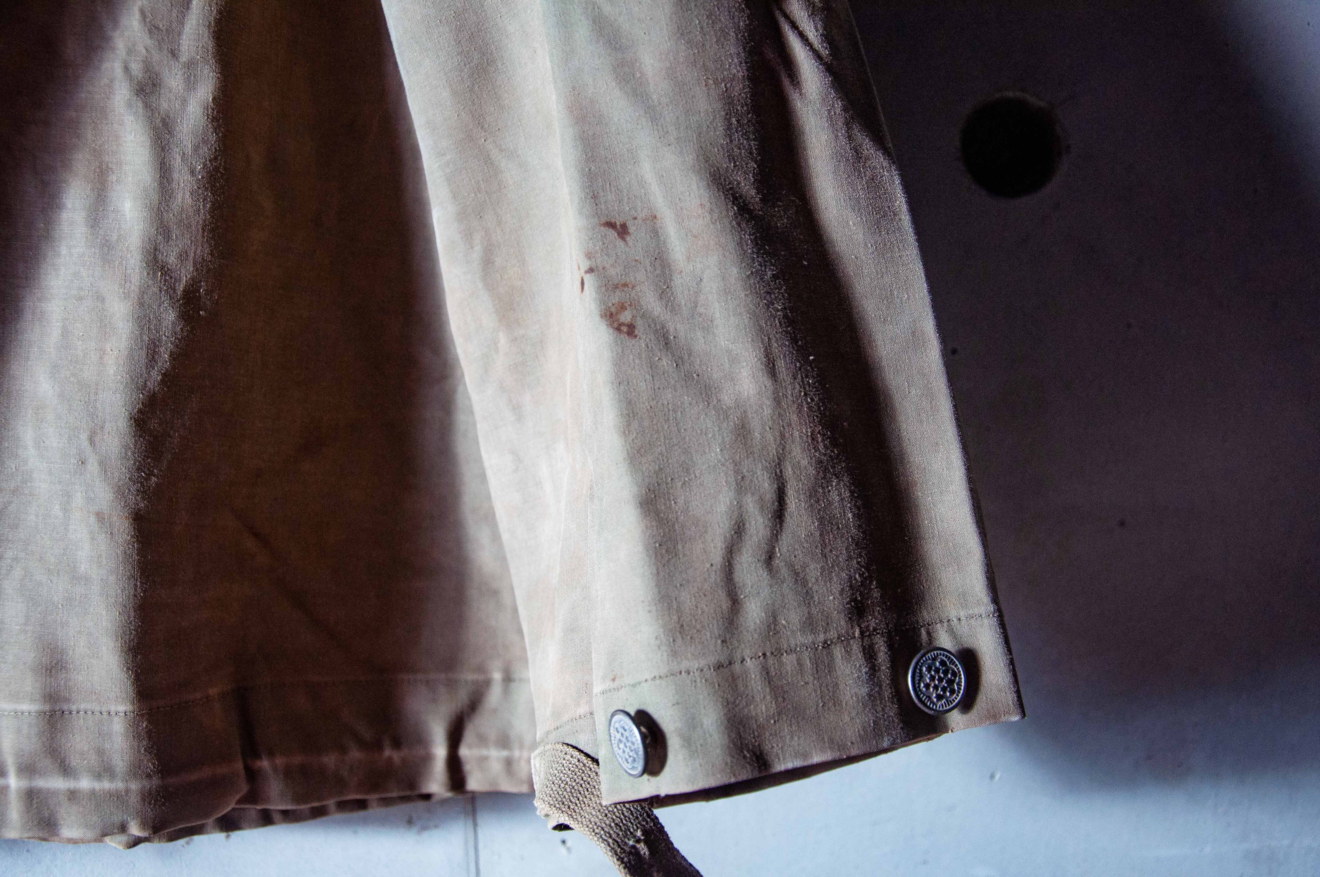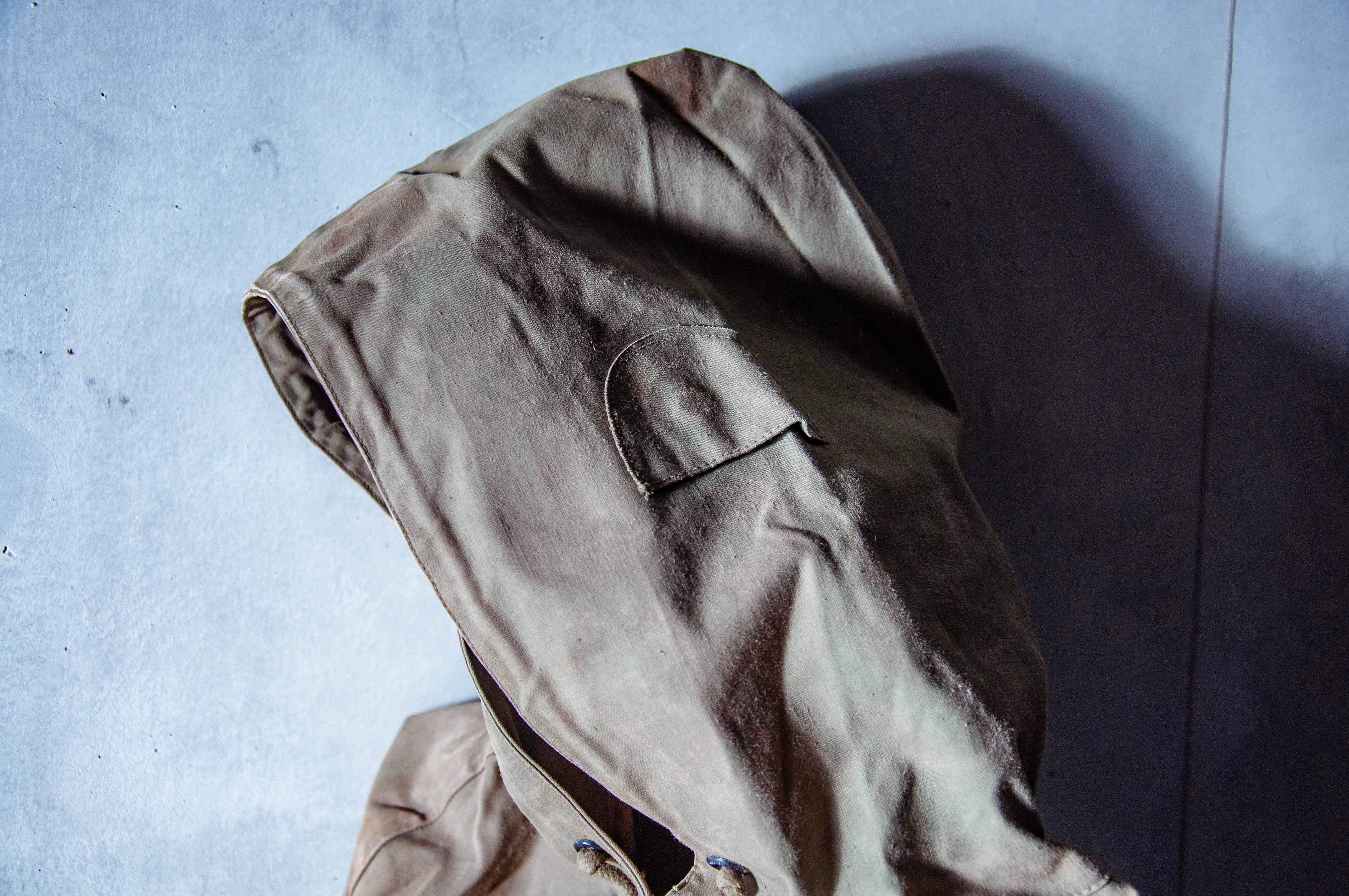 販售的這件以其將近 80 年的年紀來說品項有不錯的水準,留有因長年保存所造成的褪色及使用痕跡。五金方面袖口使用的十三星釦及胸前的鐵製勾扣,完整且狀況良好,左前方有一破損,內側接縫處的防水貼條完整,但請注意美軍這一系列的雨衣 Parka 不論全新庫存或退役品都多少存在一些原始石蠟經年留有的味道,能接受的朋友在購買前請務必暸解到這點。