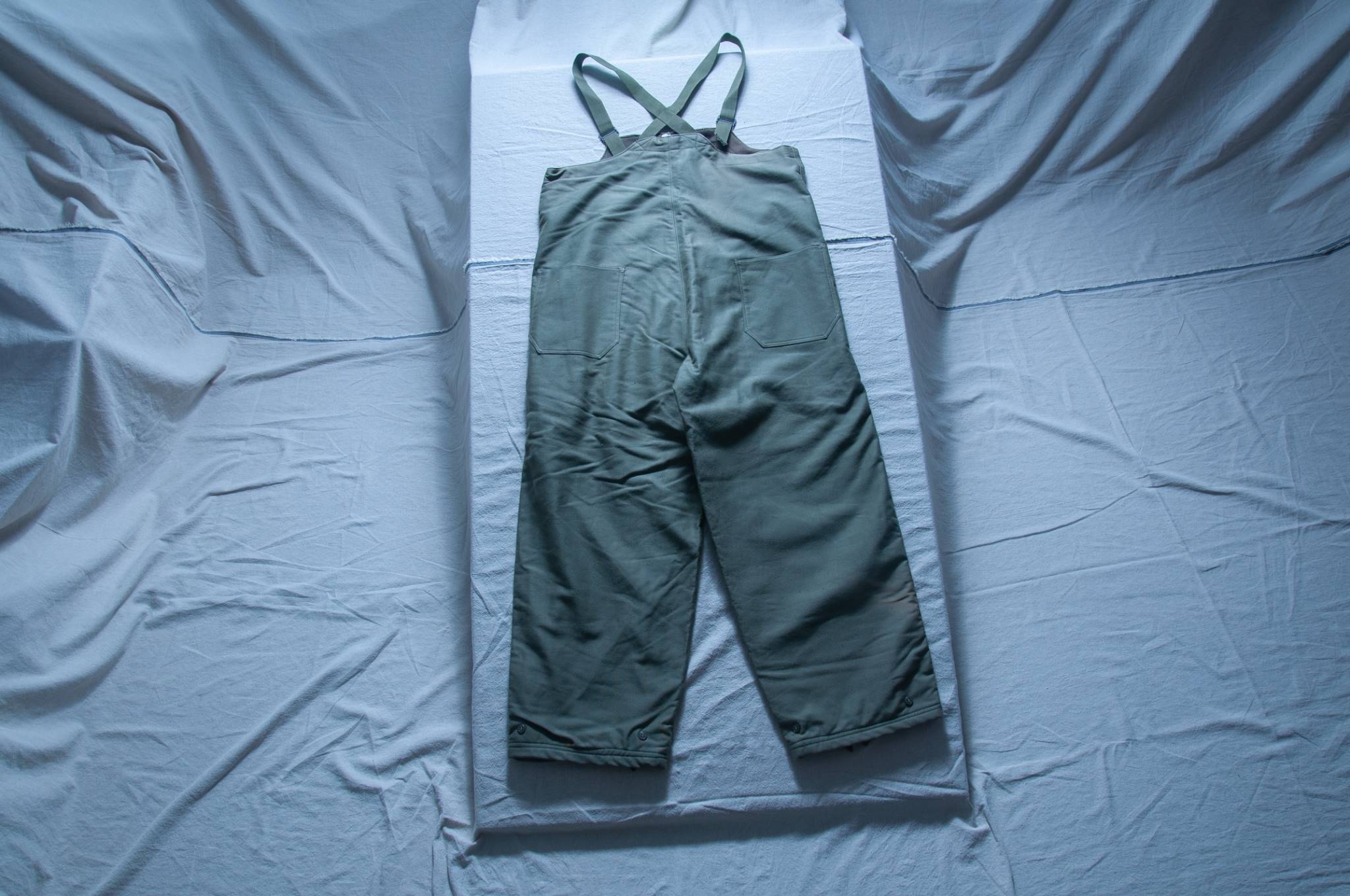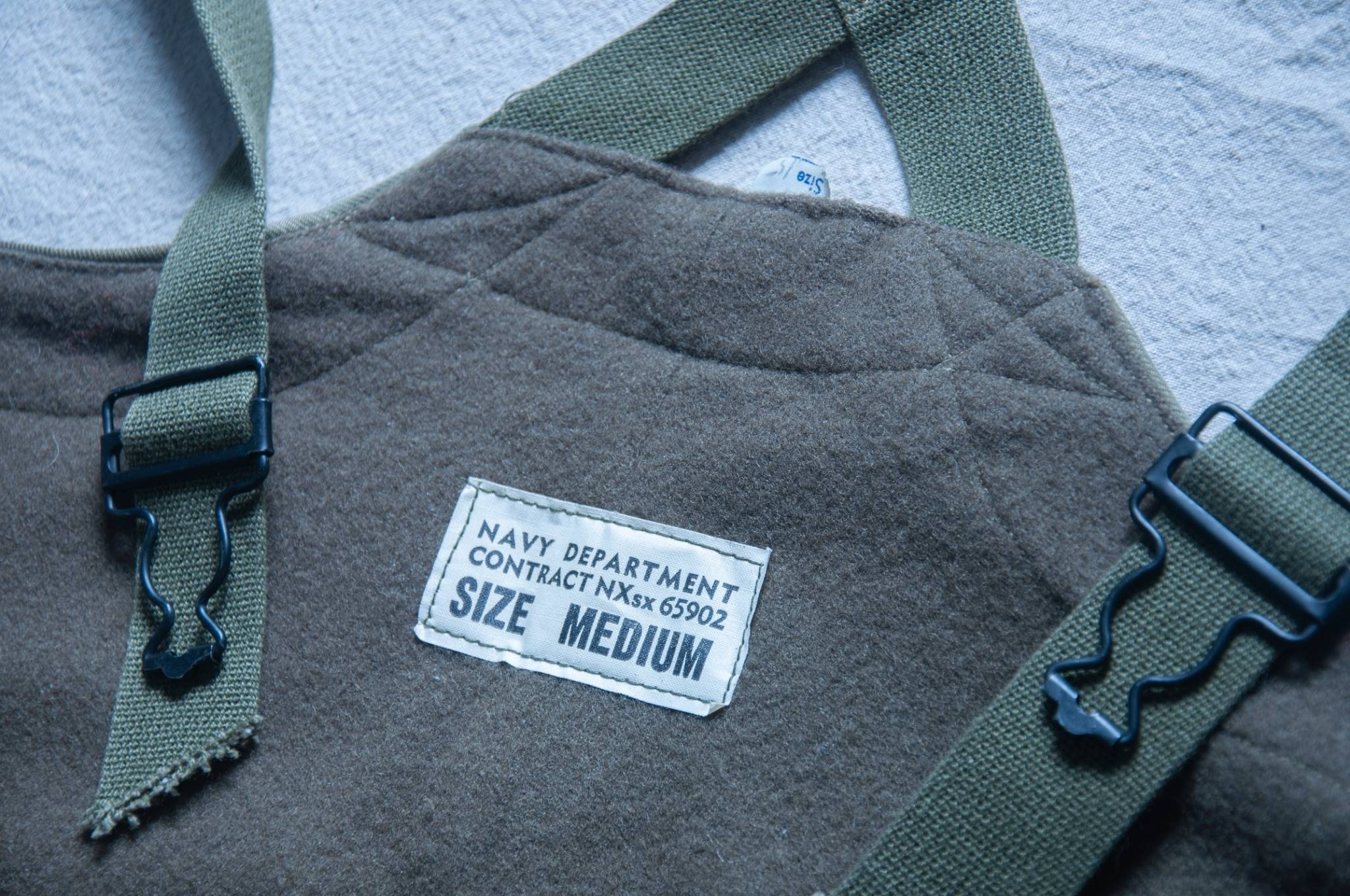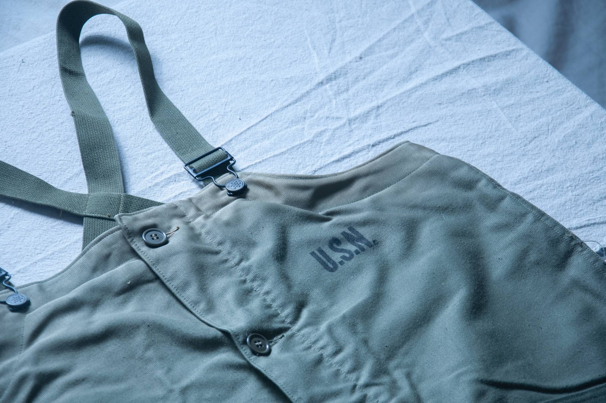 美軍二戰公發 海軍甲板吊帶褲,供士兵低溫時搭配 N-1 夾克於甲板作業使用。吊帶褲前擋外側設有鈕扣擋風片,有效阻擋甲板作業時強勁的海風,而內側為了方便士兵穿脫,則使用雙向拉鍊設計。