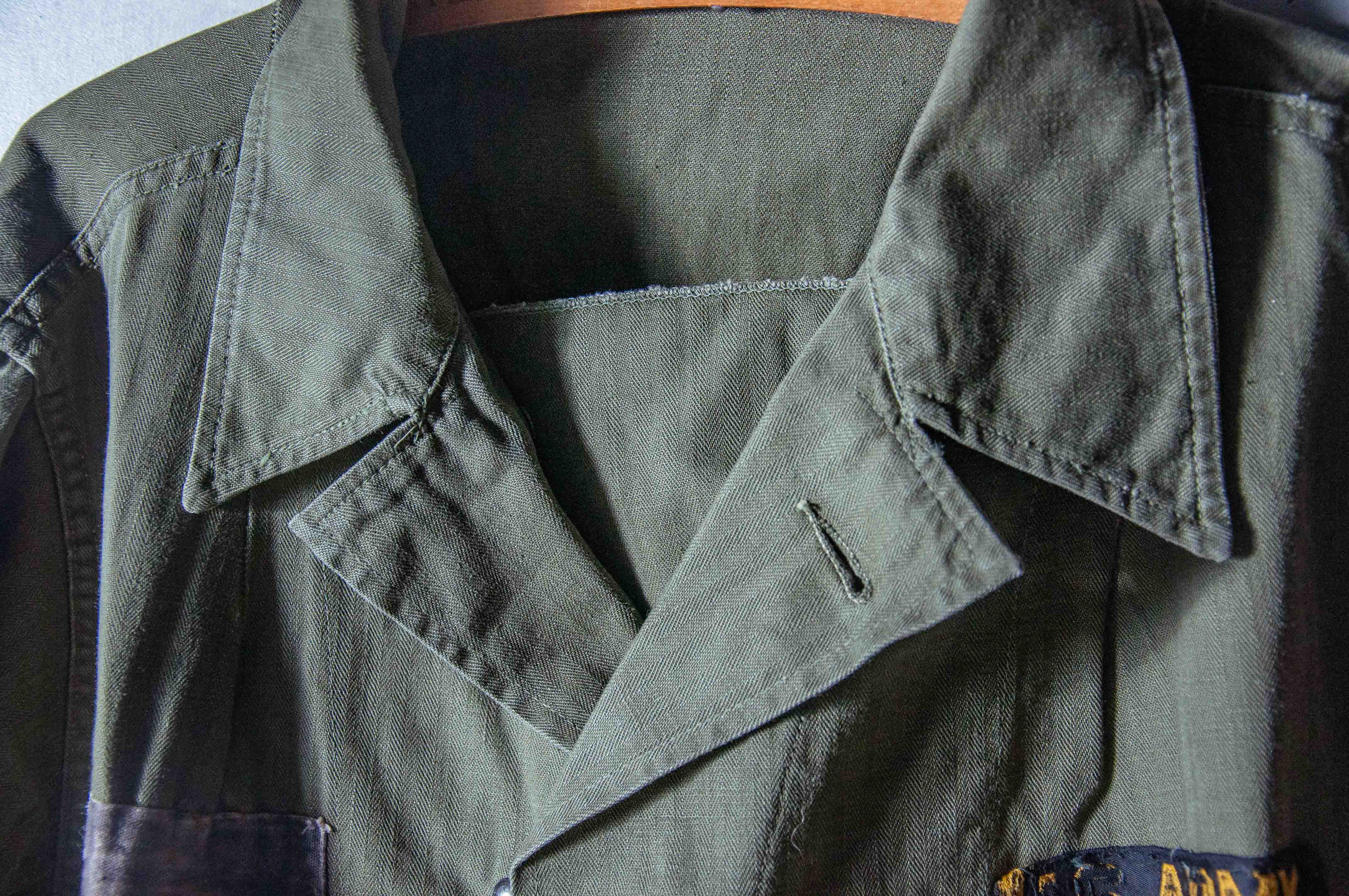 Very characteristic original WWII US Army vintage M43 Shirt, This is the second pattern. HBT fabric, 13 stars button and come with some patches. In nice vintage condition. Does have some holes and tears. But still very nice and sturdy for the age. Great piece for WWII collection.