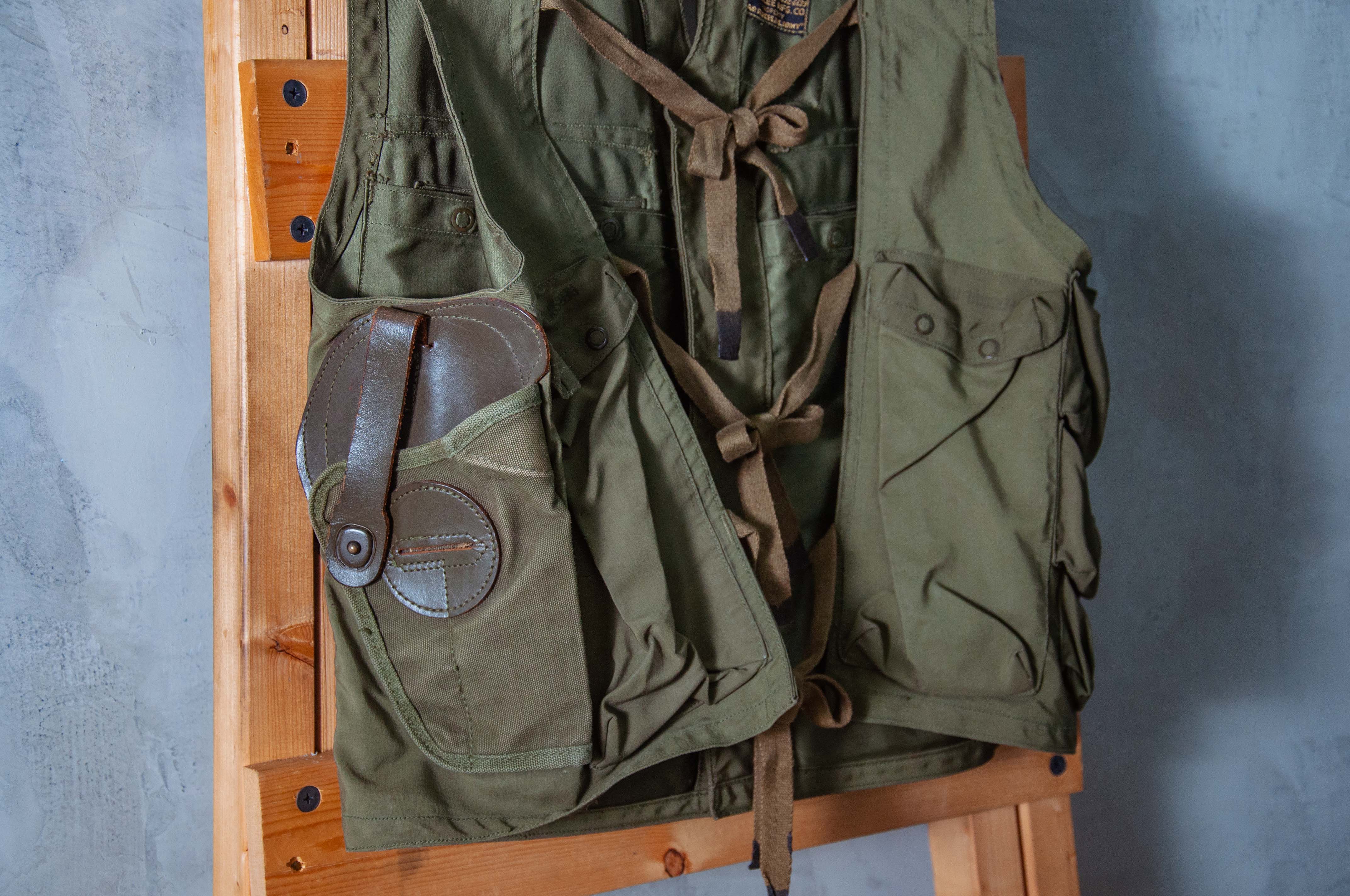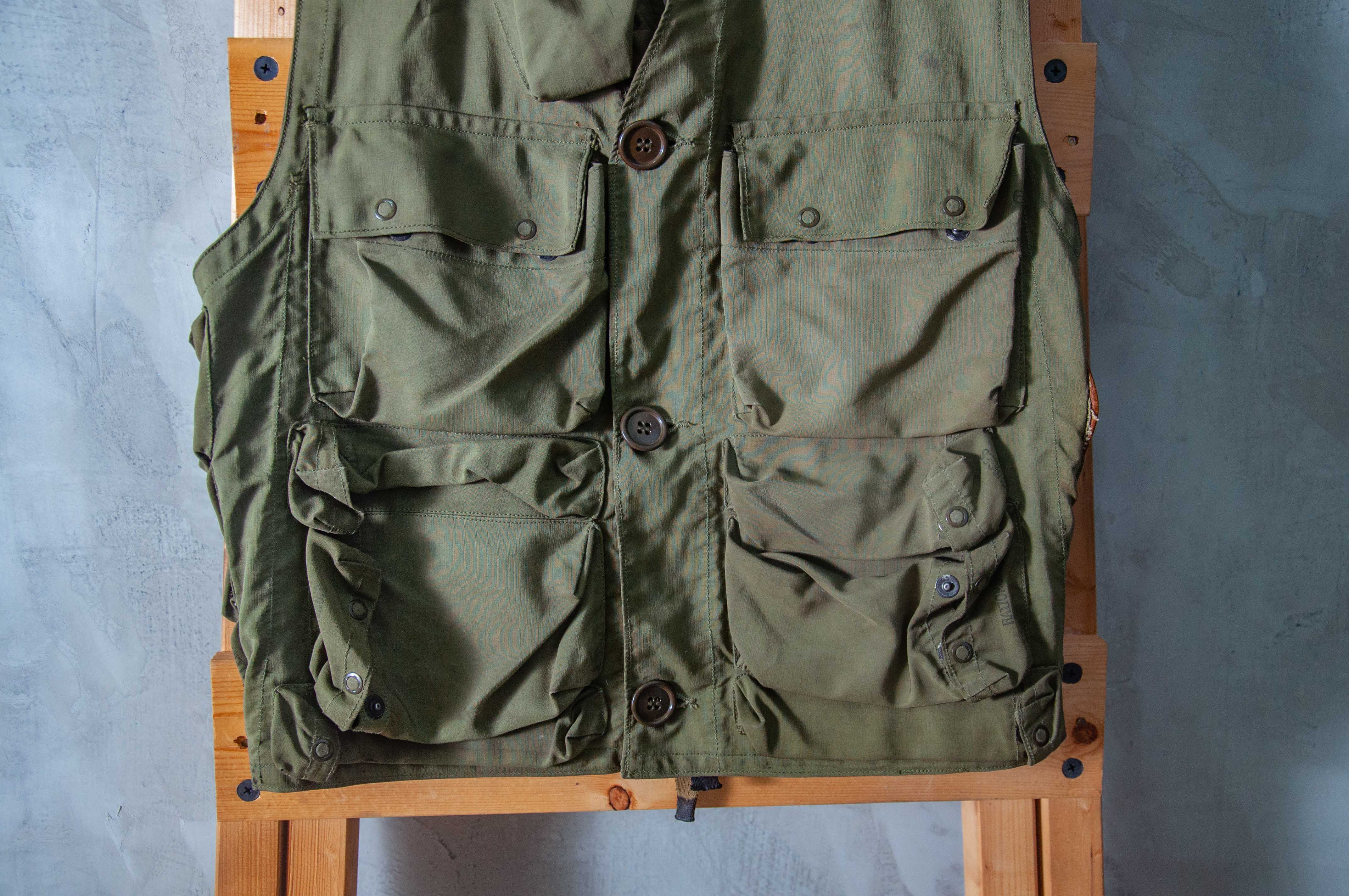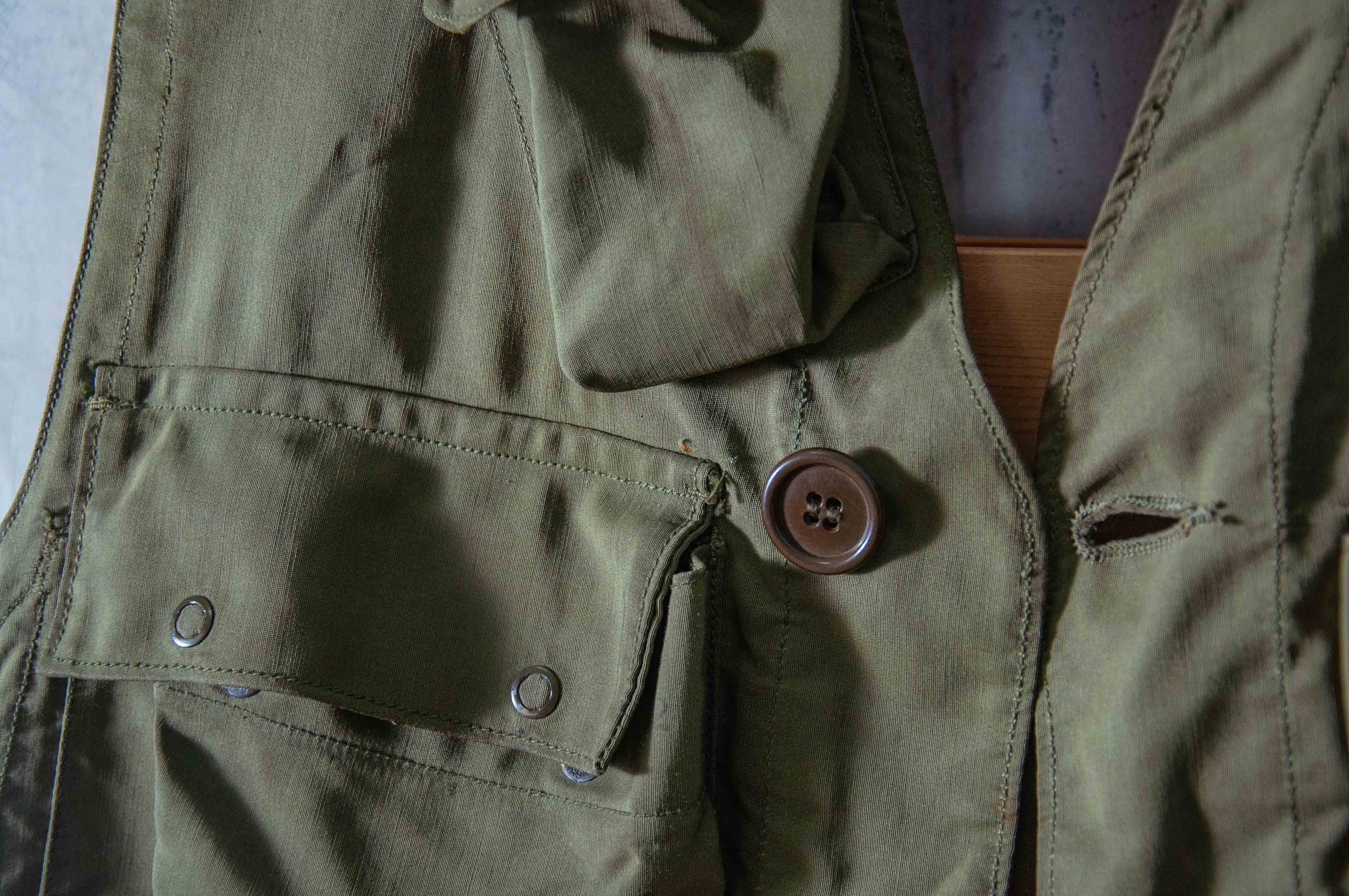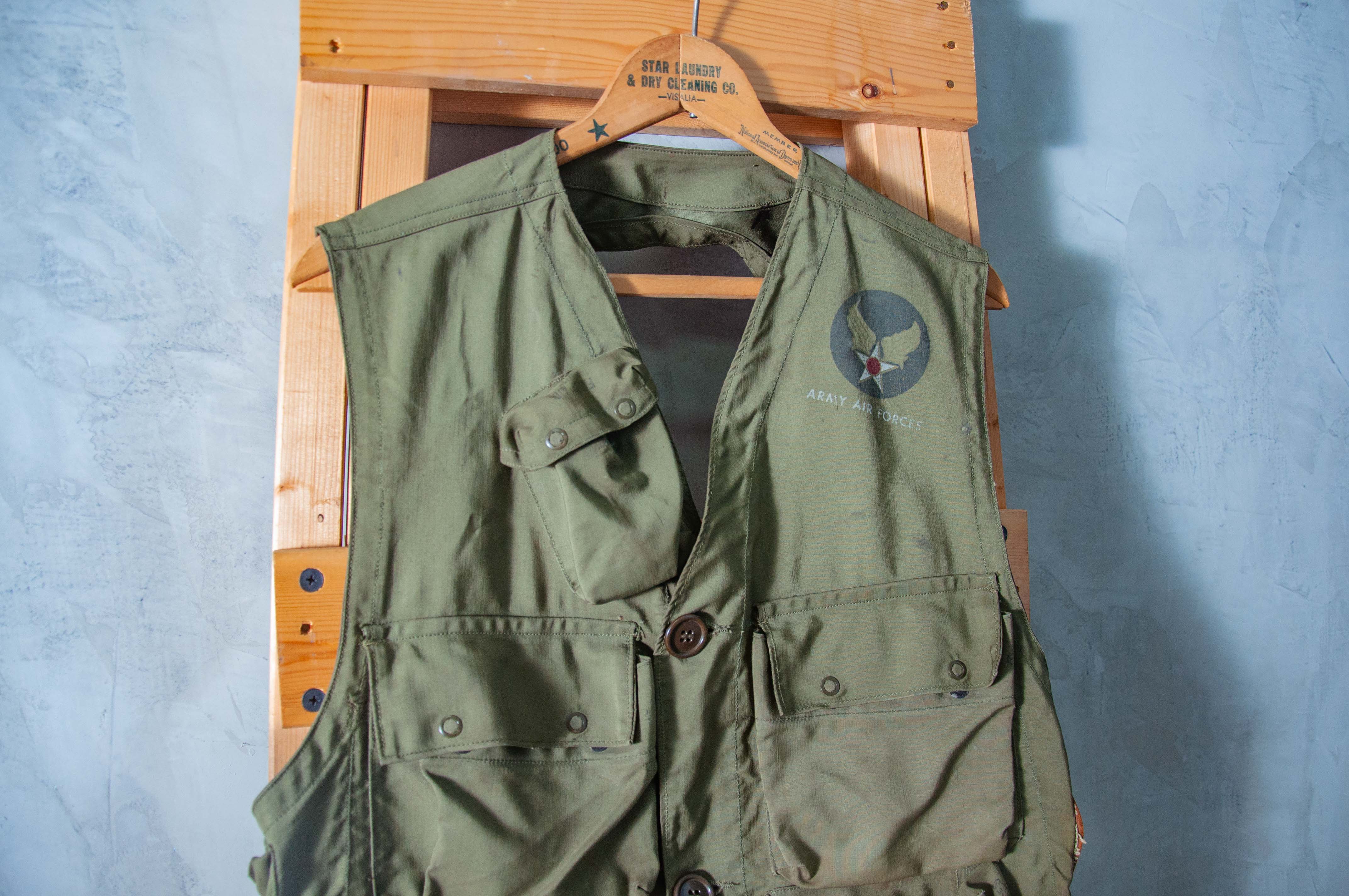 肩上印有只存在於 1941 - 1947 短短七年時間的陸軍航空隊飛行之星標章,背後的調節綁帶可因應各種身材尺寸,也是此件背心非常特別且吸睛的設計。多口袋原本是用來放置飛行員遇難時能夠提供存活條件的求生工具,但同時也為這件背心留下具有高度機能性的應用可能。本件為公發退役品雖有士兵使用後或存放時留下的污漬與痕跡(如照片所示),但這種歷史的軌跡正是市面上那些復刻成衣無法比擬複製的。值得收藏且非常實用。不論男女這件背心都適合在任何季節甚至酷熱的夏天著用增加穿著的細節與層次。