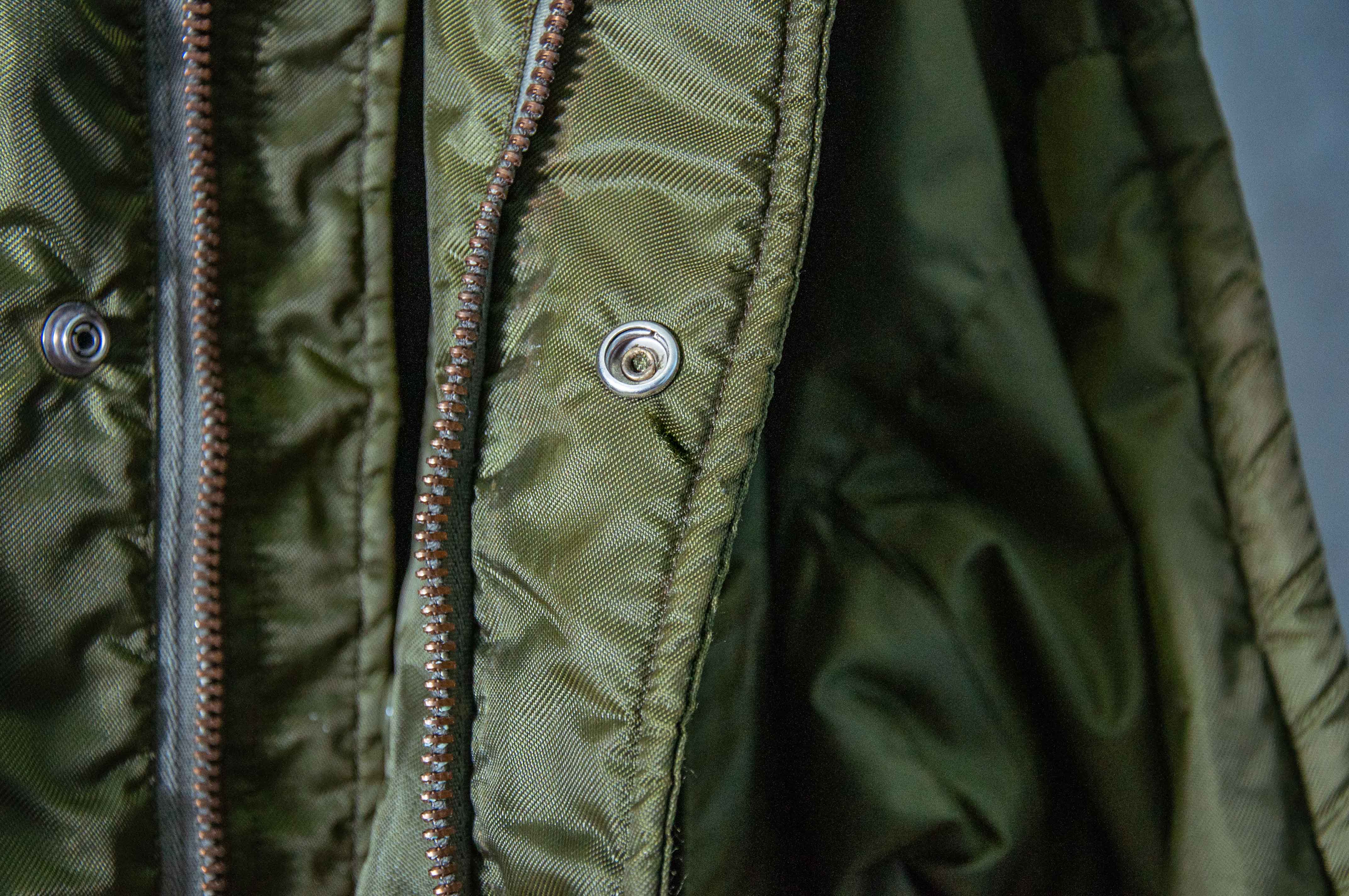 不過 A-1 在最主要的外層材質選用上,並沒有 N1 的 Jungle cloth 或 一般 A2 混紡材質上所使用到的棉料,而是採用了防水性極佳的尼龍材質,因此表面的面料上帶有著獨特的亮面色澤,也讓他有著比其他兩款更好的防水性,即使在外套被浸濕的狀態下也能起到防寒的作用。