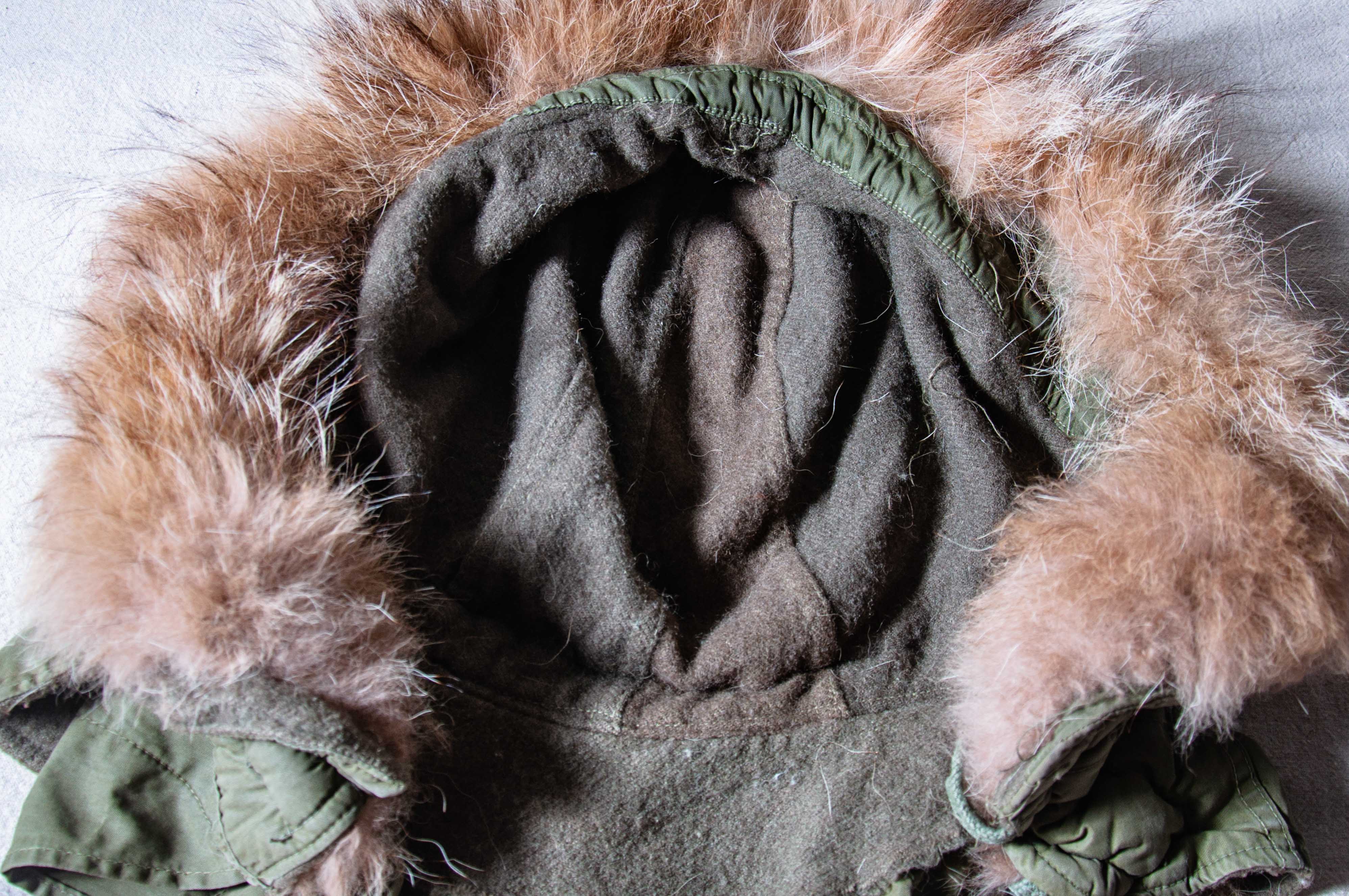 Original Vintage US Army M65 M51 Wolf Fur Hood. In used condition. Can fit and use with M-65 M-51 Fishtail Parka & Field Jacket.