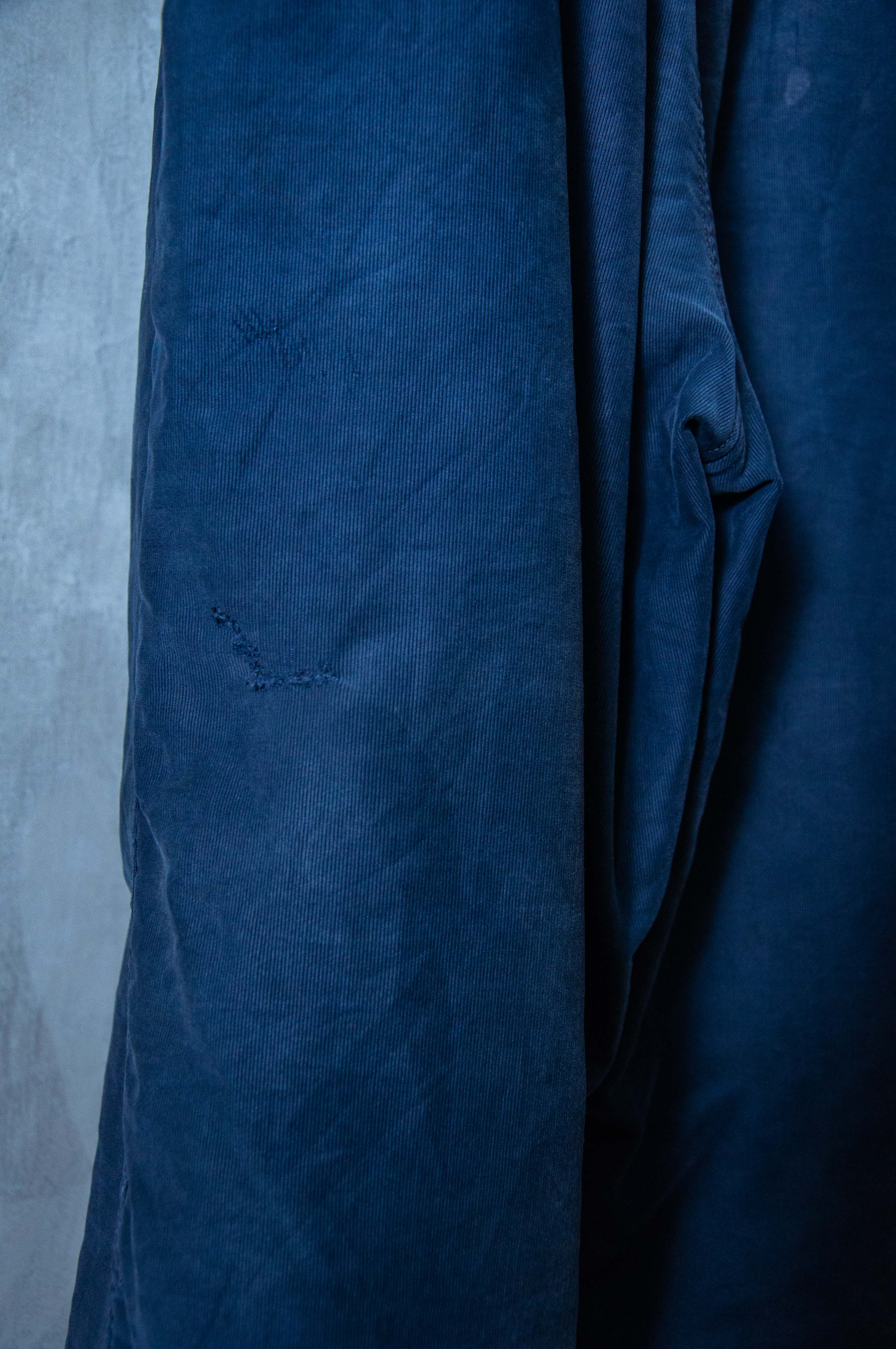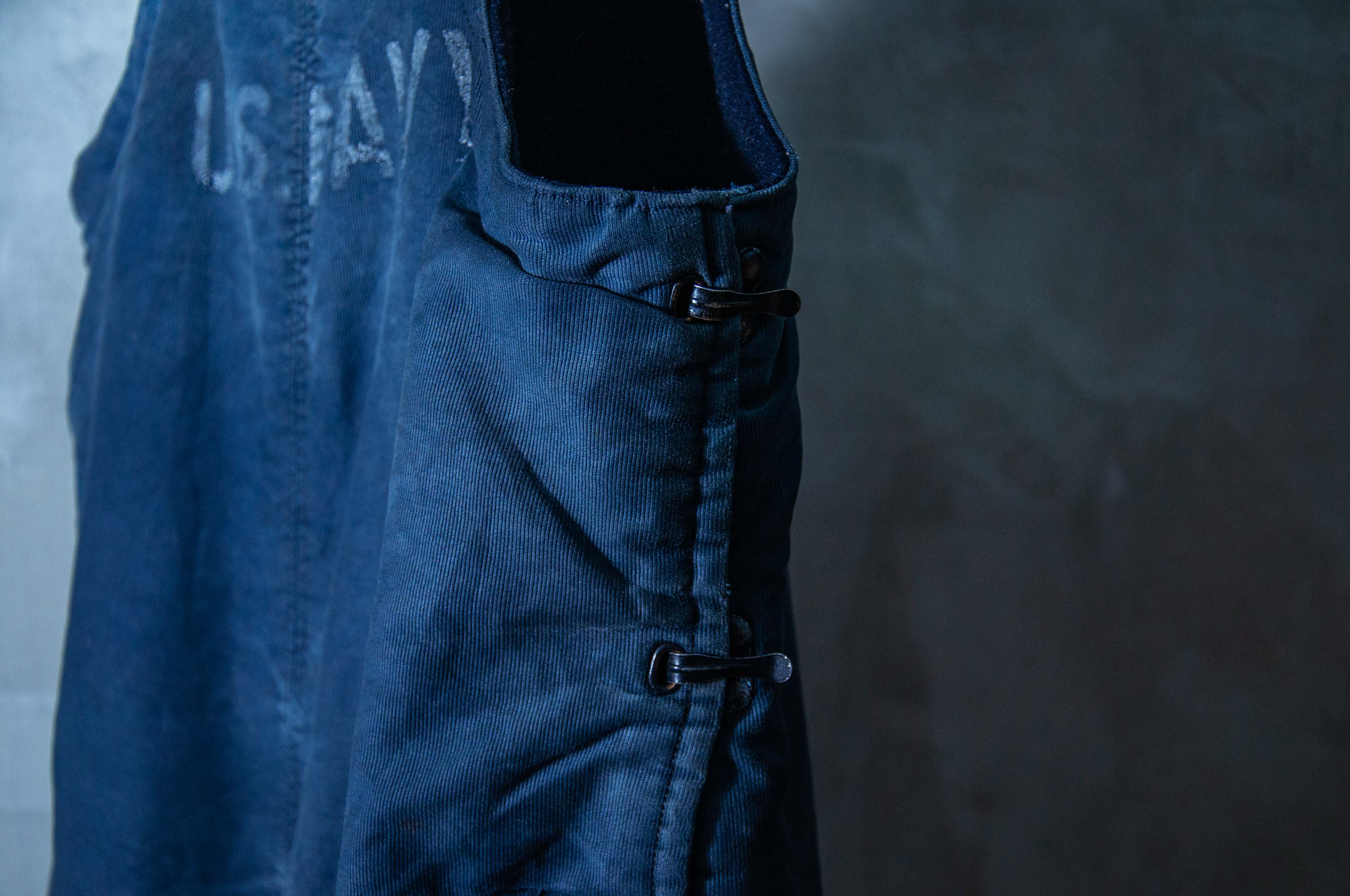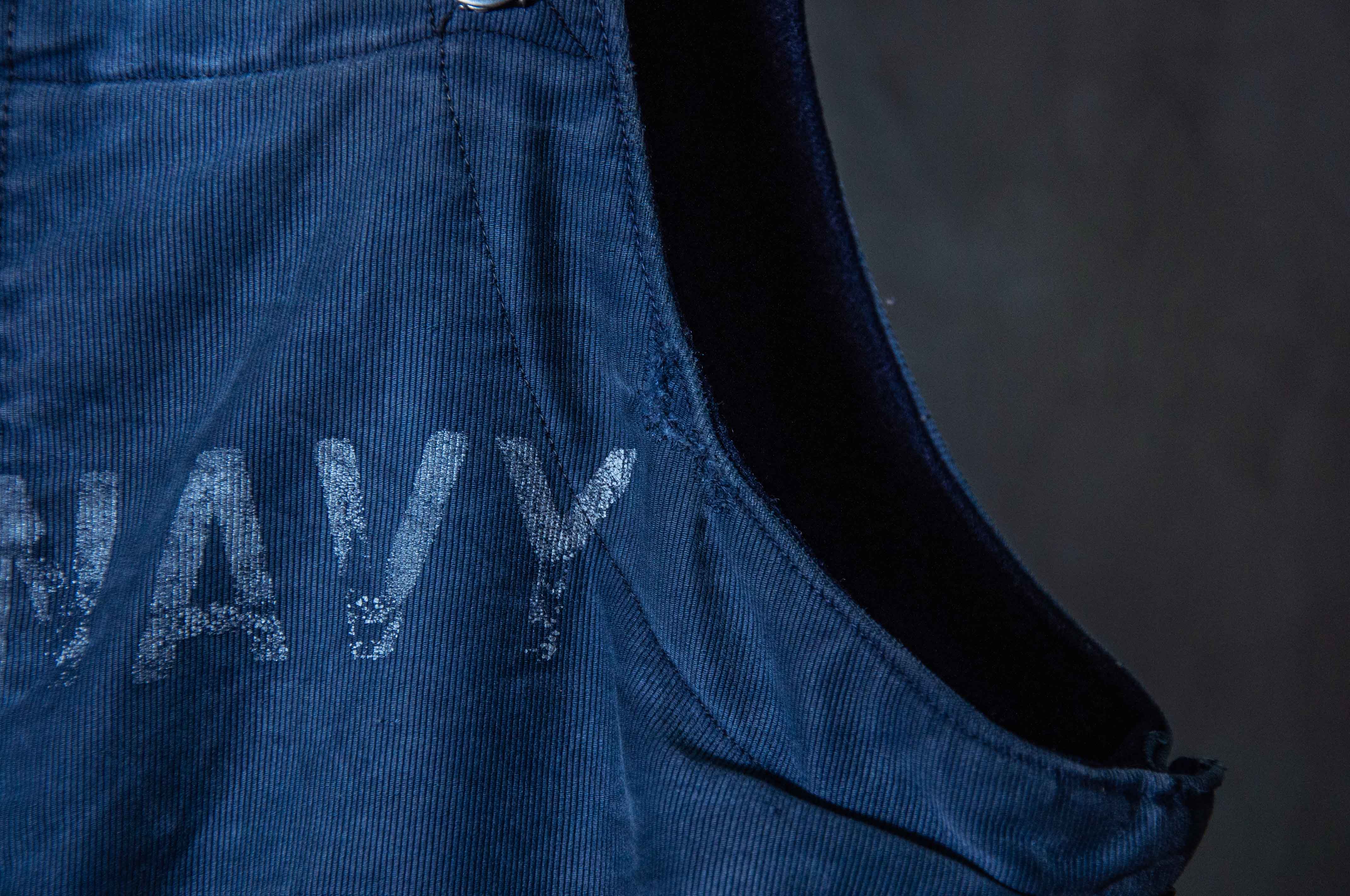 這次所釋出的是美國 40年代 二次世界大戰 原版海軍退役品。US NAVY 鋼印清晰,整體有著用、污漬、破損、修補及經年變化的痕跡。褲腳束繩已移除,鐵勾扣完整且狀況良好。非常個性的一條軍用古董吊帶褲。