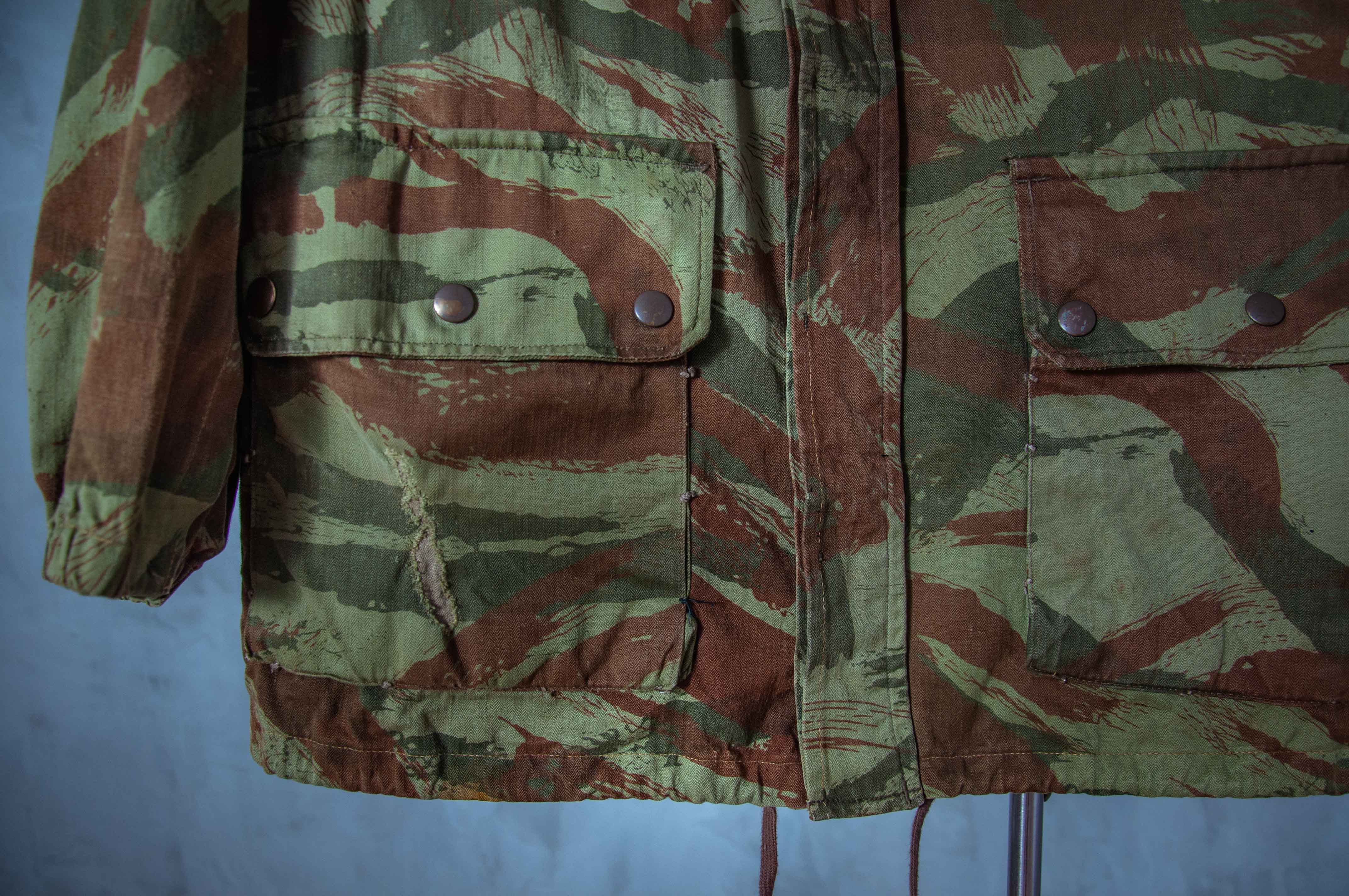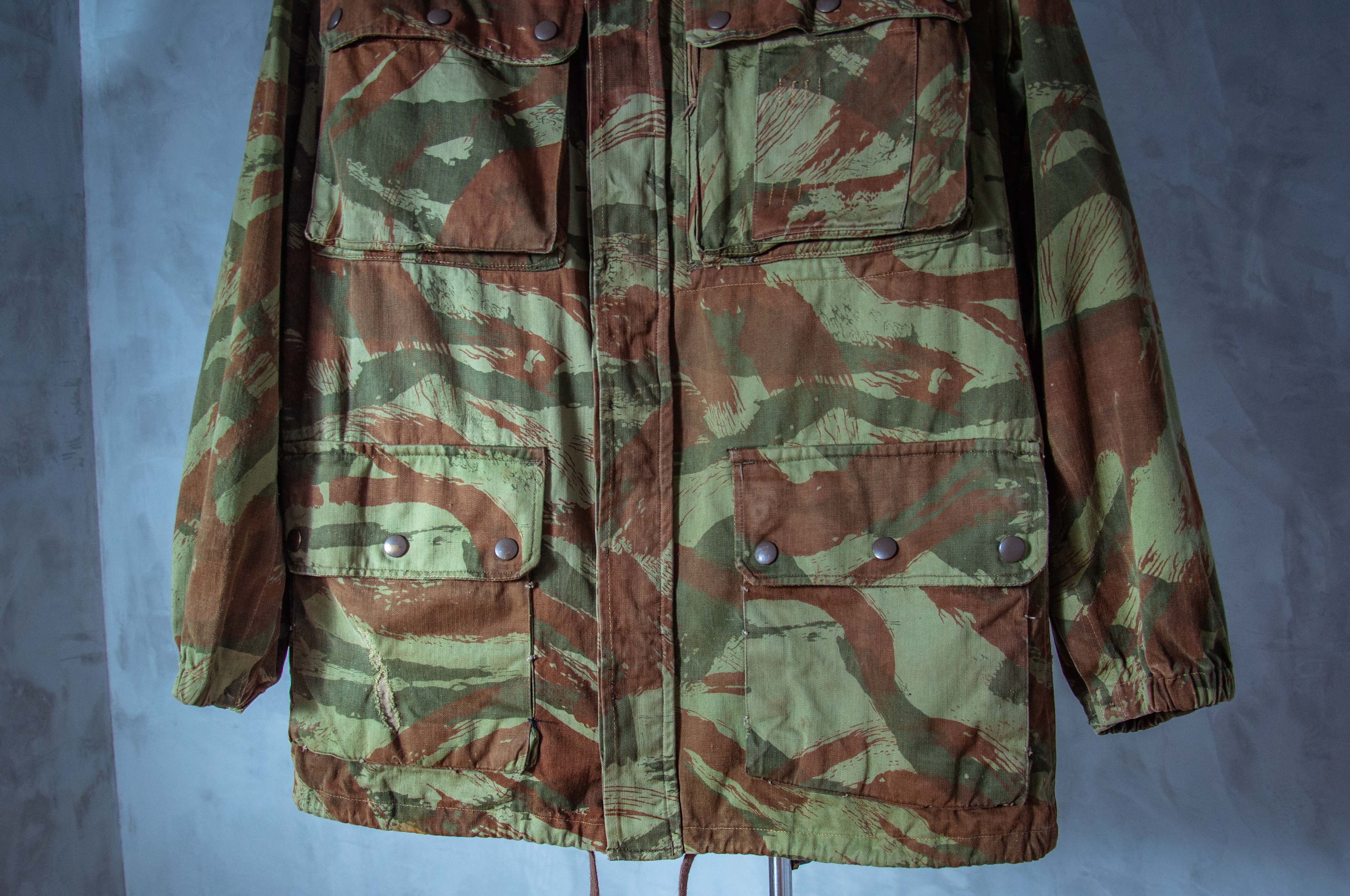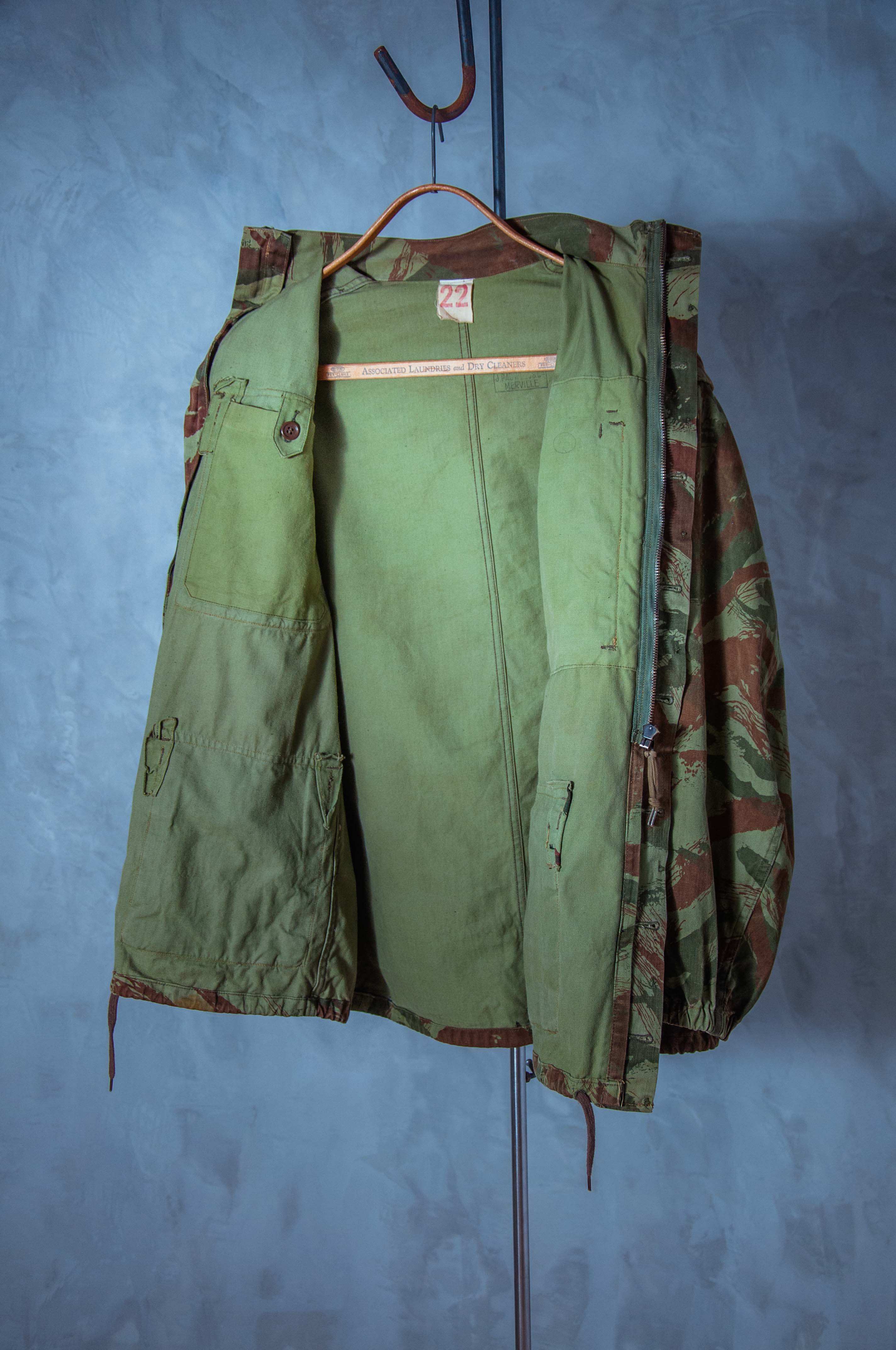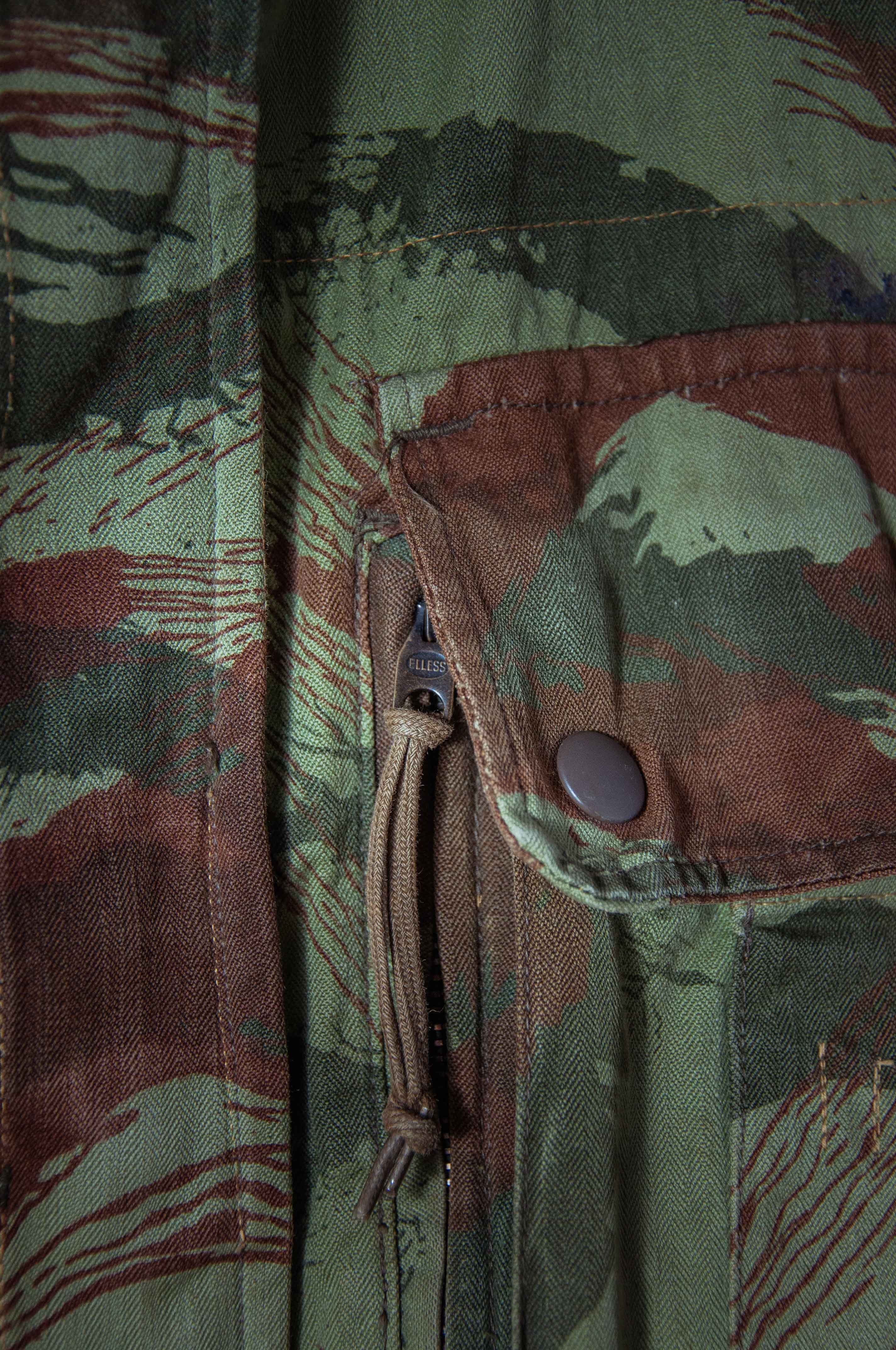 此件法國陸軍公發蜥蜴迷彩傘兵罩衫外套為1950年代 至 1960 年代間配發給空降傘兵及特勤部隊所使用之公發品。原裝拉鍊品項漂亮功能作動正常順暢,圖片左下口袋有一處修補,公發退役品有士兵正常使用後的使用痕跡、污漬、小破損及修補,但總體而言品項仍然相當優良,經年變化後的迷彩色澤亦相當漂亮。非常經典及實穿的法軍收藏。