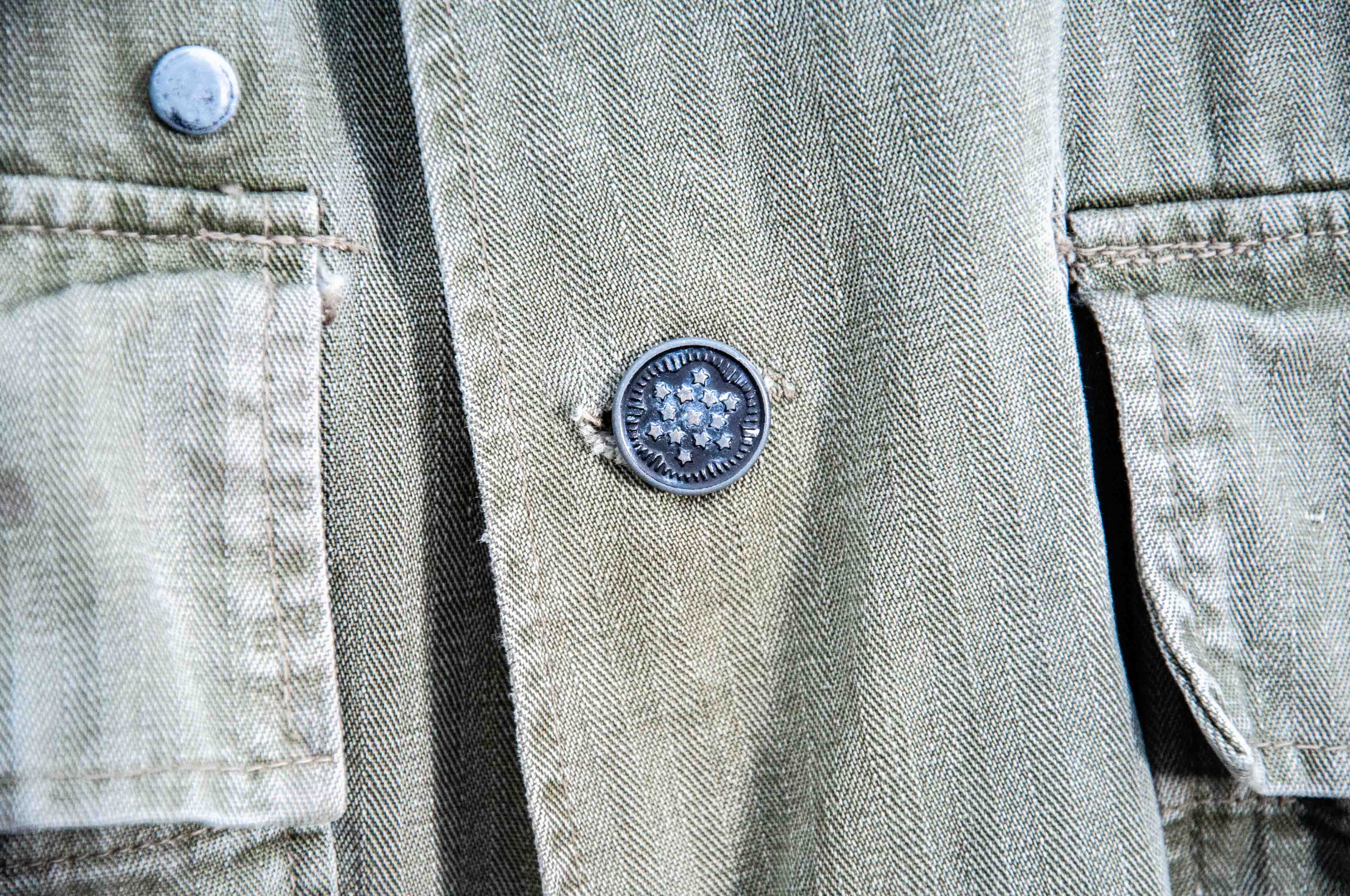 五金使用 40 年代 陸軍使用的十三星釦,皆完整無缺。左臂上縫有 1992 年已裁撤的美國陸軍第四軍團之軍團章。此為退役軍品,有著使用過後的一些污漬及破損,帶有非常具個性的經年著用感。